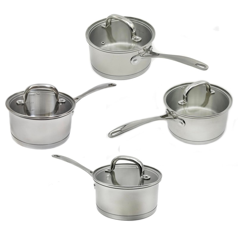 - TEMPERED GLASS LID LID & COOL GRIP STAINLESS STEEL HANDLE - The Cookware set comes with tempered glass lid. The glass lid seals in the flavor and nutrients for a healthier and better tasting food. fine mirror polished stainless steel and easy grip design handles provide a secure, solid and comfortable grip. The handles are double riveted by hand and stays cool to the touch, always
