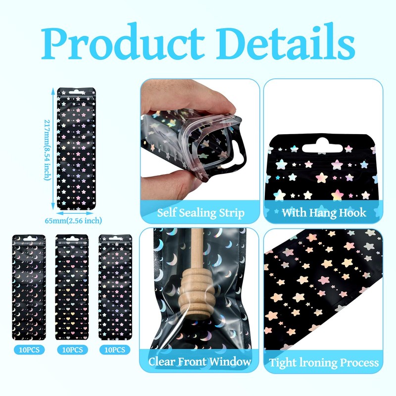 Magibeads 30Pcs Resealable Small Packaging Bags 8.54 x 2.56 Inches Black Star Heart Patterns Clear Gift Bags Sealable Packaging Pouches for Small Business Pen Hair Pins Cosmetic Brushes
