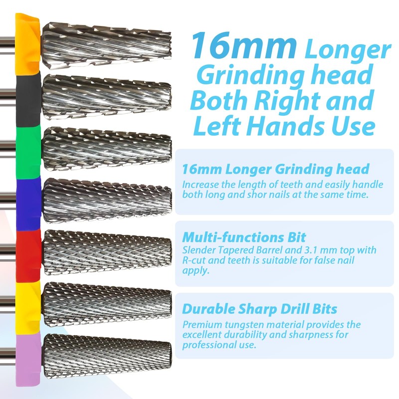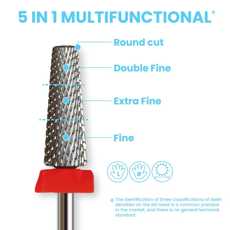 - Safety Bits For Professional Users and Beginners: The design of 5in1 mixed 3 Coarseness with R-cut and teeth on the top brings better work. Two-way rotation is suitable for both left and right-handed. The bit has 16mm grinding head and is designed to handle the working both on long and short nails.