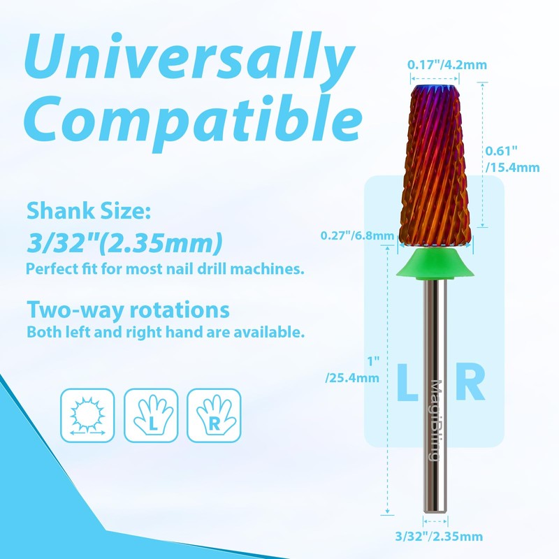 - Professional Bits Fit with Most Nail Drill: 3/32" Shank Carbide Bit is suitable for most drill machines. Classic large tapered shape has more comfortable angle of using, adjust the cutting capacity through different parts of grinding head.
