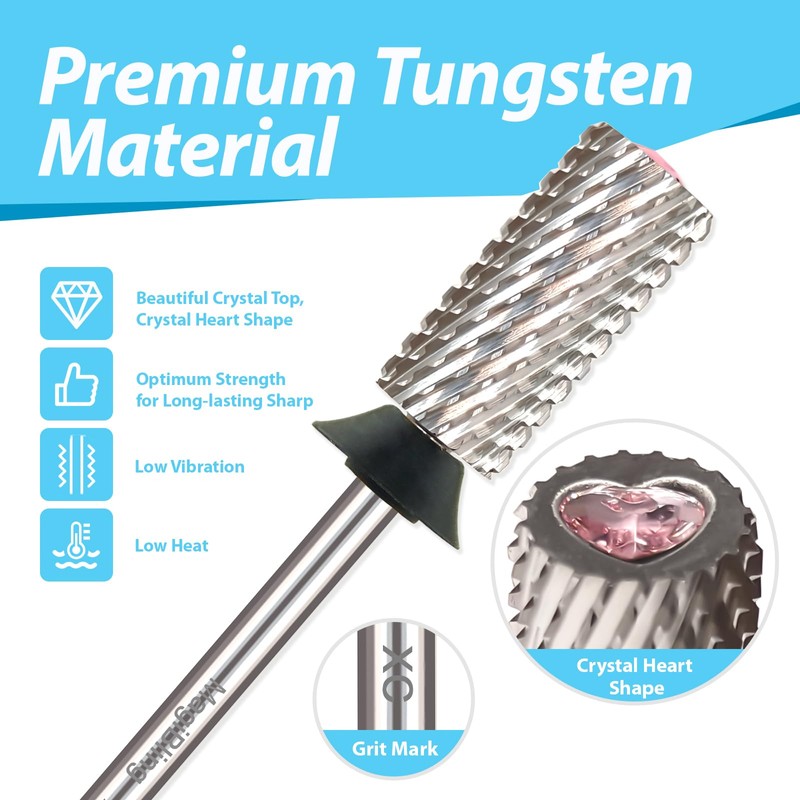 MagiBling Large Barrel Tungsten Carbide Nail Drill Bits, Heart Shape Crystal Top, 3/32'' Safety Cross Cut Bit, Left Right Hand Use, Manicure Cuticle Gel Polishing, Remove Gel fast, Extra Coarse.