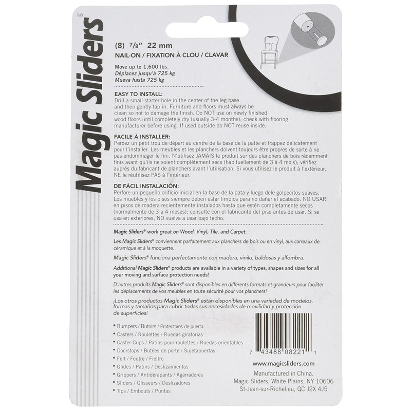 8 pack, 7/8", round nail on sliding discs, moves up to 1,600 lb, won't scratch your floors, works on any kind of surface, wood floors, vinyl, ceramic tile, carpeting, for wooden leg chairs & tables, nails are attached to sliders as a 1 piece application, Carded.