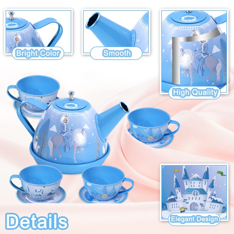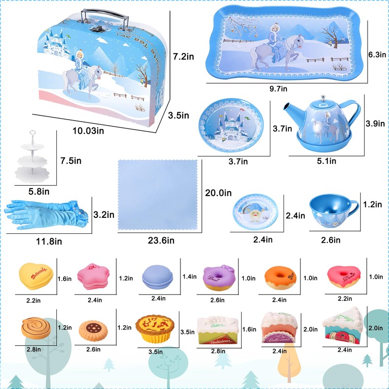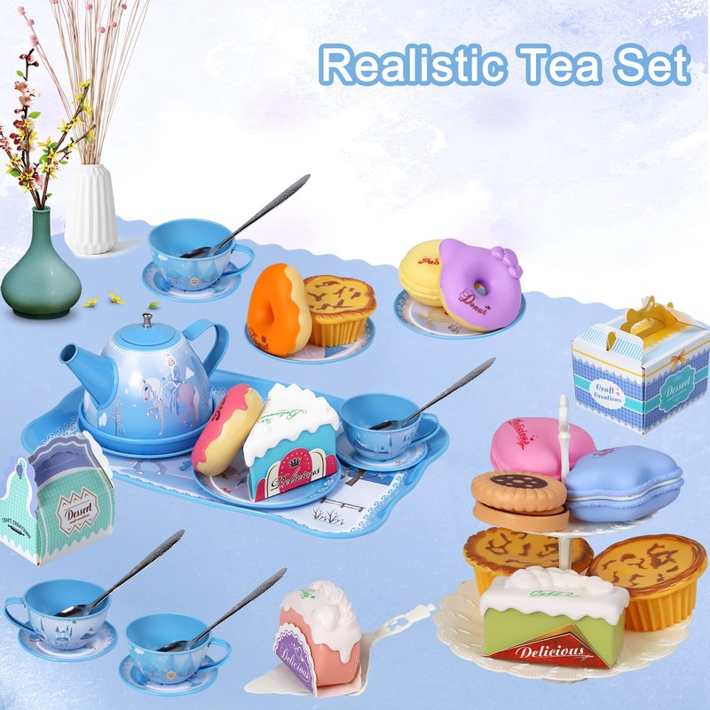 - 【Fairy tale princess theme tea toy】This tea set for little girls is made of non-toxic tin-coated iron material, good formability, corrosion resistance. The dessert accessories providing harmless plastic material, has long-lasting strength and use. Endless hours of tea time theme pretend role play for your kids
