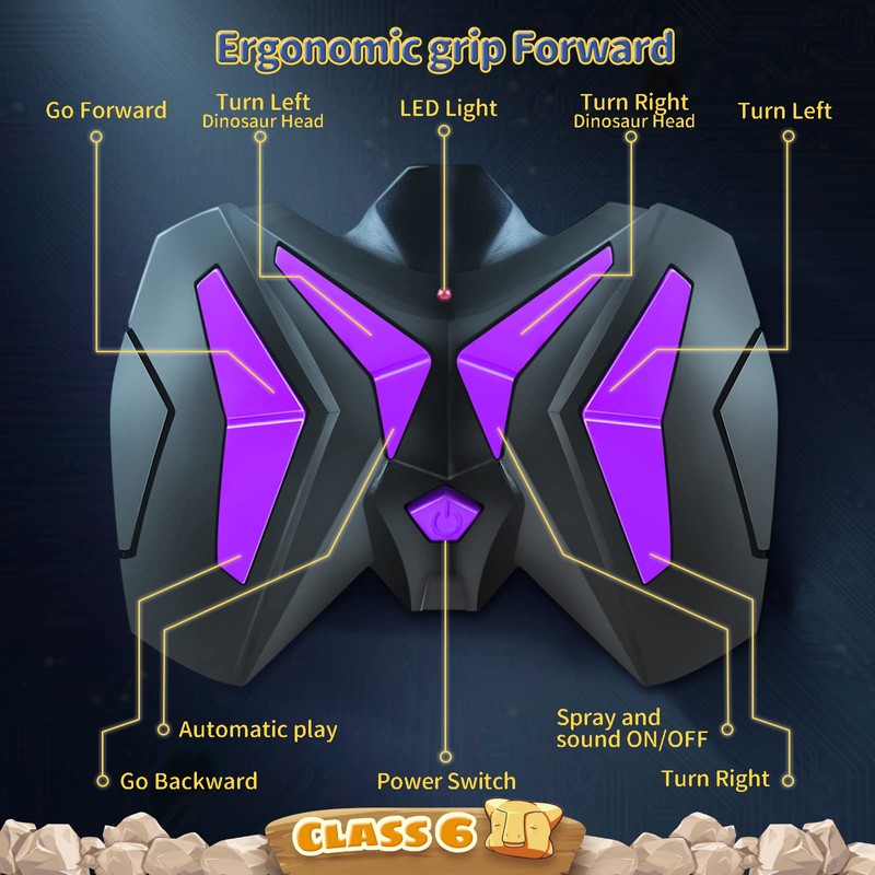 - Dinosaur Robot: Dino can go forward, backward, turn left/right, shake its head, turn around, roar, cool lights and water mist spraying which looks like fire breathing..Comes with 2 packs of rechargeable batteries. Welcome to DINOSAUR PLANET.
