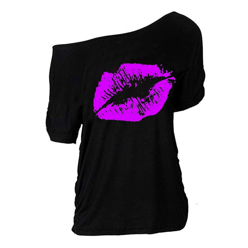 MAGICMK Women Casual Plus Size Lips Print Off Shoulder T-Shirt Tops(Black+Purple,3XL)