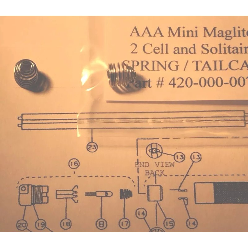 Contact Ground for Tail Cap Assembly Part No 420-000-011 (18) and Spring Part No 420-000-007 (17) “AAA" 2 Cell Mini Maglite Flashlight and “AAA" Mini Maglite Solitaire Flashlight . Genuine OEM Part. Fits Tail Cap assembly 120-000-348. (Ground Contact and Spring)