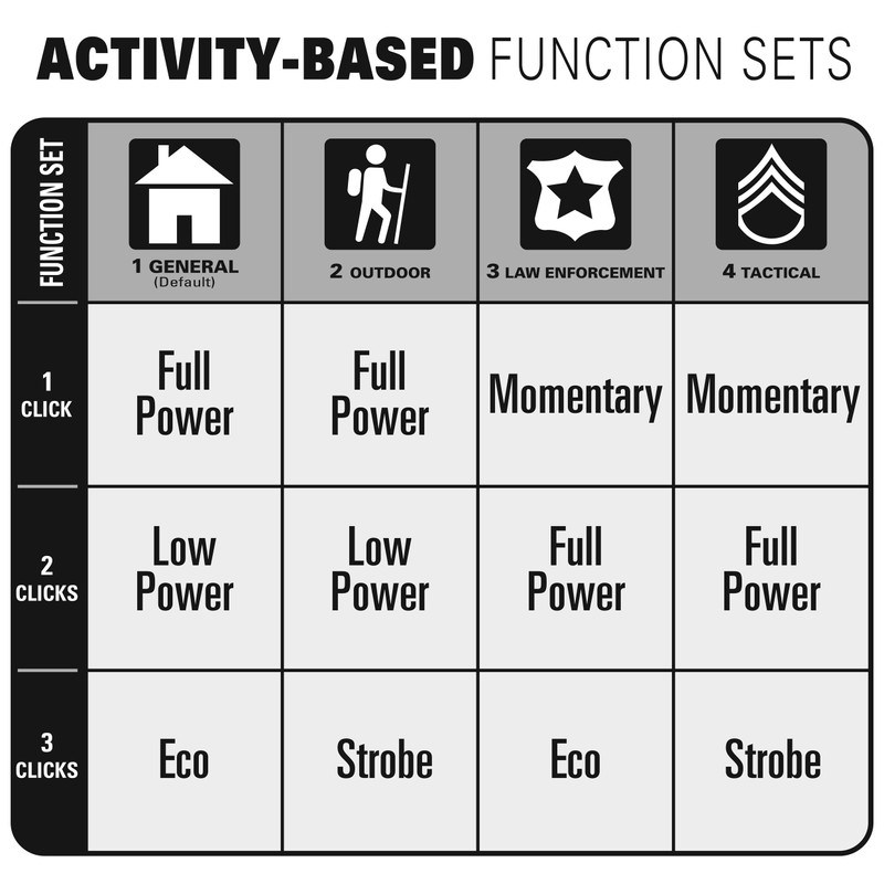 - Activity Based Function Sets include General, Outdoor, Law Enforcement and Tactical