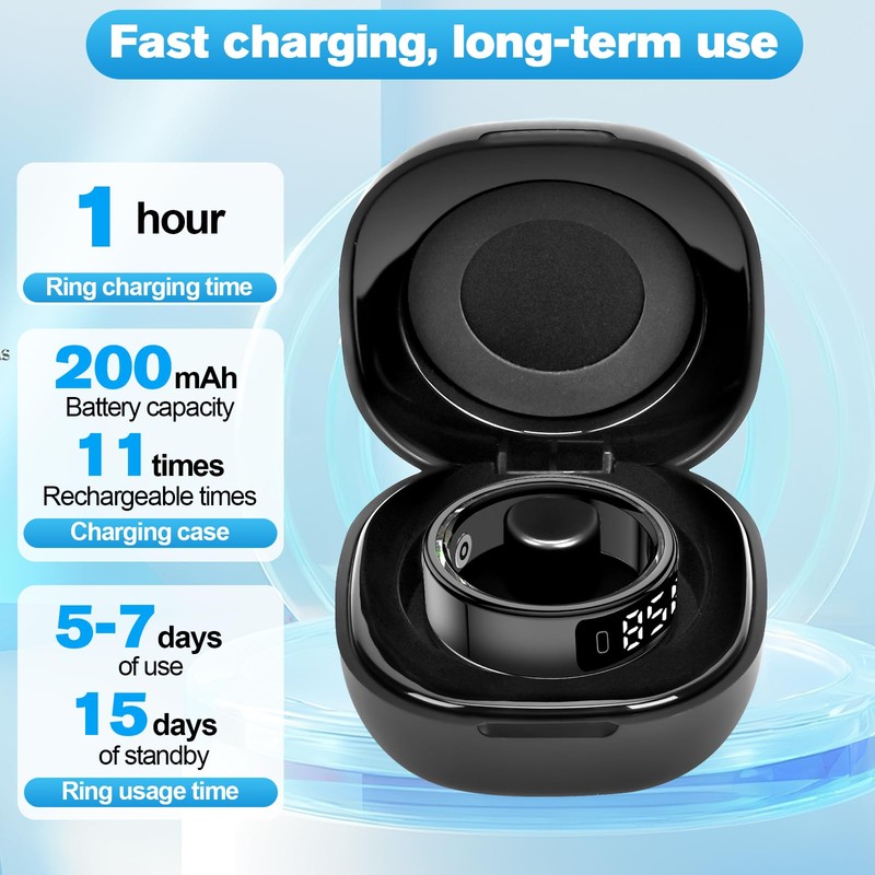 - Exclusive charging compartment: The package includes a smart ring charging compartment. Just align it with the charging port and it will charge quickly. The charging case with full battery capacity can charge the health ring about 11 times, providing long-lasting power.