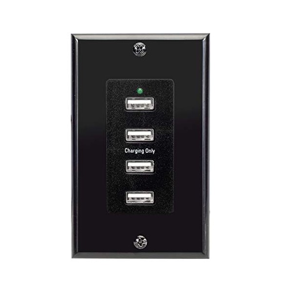 - A Black wall mount charger that has 4 USB charging ports that can be installed in all types of vehicles and for home use all well.