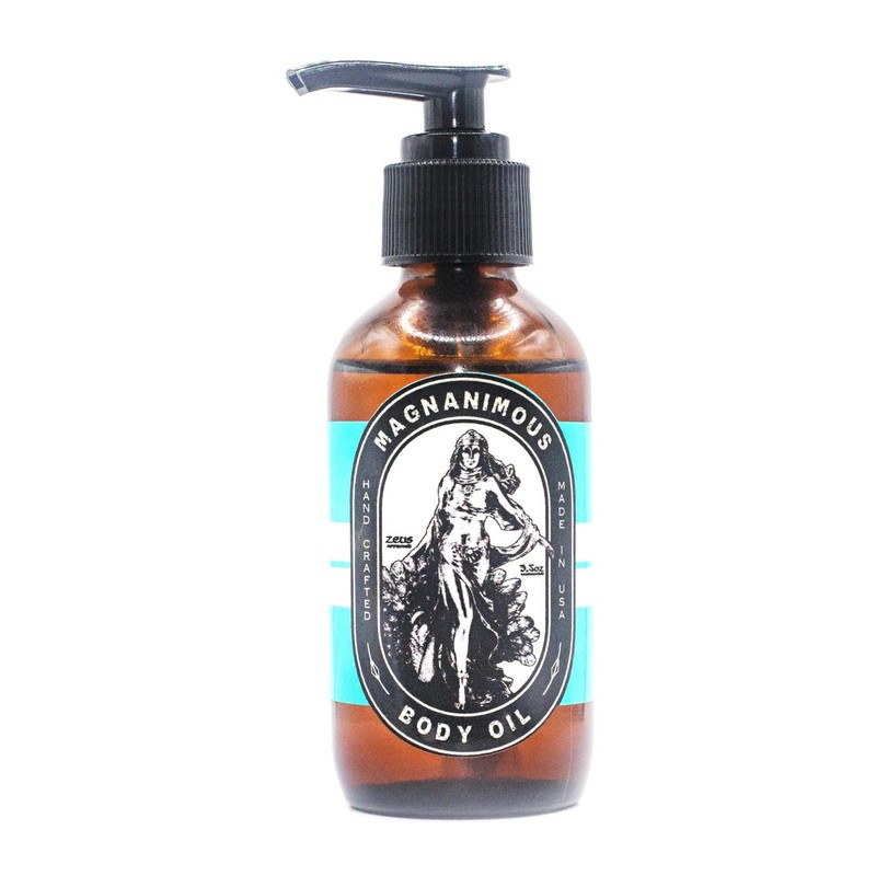 YOUR MAGNANIMOUS BODY OIL FOR THE SOFTEST, SMOOTHEST SKIN ON THE PLANET - HERA APPROVED! MAGNANIMOUS BODY OIL IS ALL-NATURAL, HANDMADE IN CANTON, GA USING 8 PREMIUM, ORGANIC CERTIFIED, AND COLD-PRESSED EXTRACTED OILS. MAGNANIMOUS BODY OIL IS NOT ONLY MAGNANIMOUS FOR YOUR SKIN, BUT WORKLS MAGNANIMOUSLY WELL ON HAIR (TO CONTROL FRIZZ), NAILS, CUTICLES, AND MORE... GREAT AS AN AFTER SHOWER MOISTURIZER, FOR DRY SKIN RELIEF, SENSITIVE SKIN, AIDS IN ECZEMA, PSORIASIS, RAZOR BUMP REDUCTION, AND MORE... PERSONALIZE YOUR BODY OIL WITH THE SCENT OF YOUR CHOOSING. FOR THE SOFTEST, SMOOTHEST SKIN ON THE PLANET - HERA APPROVED!