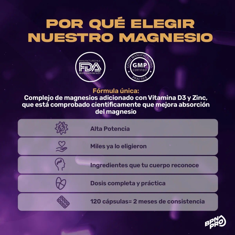 - Magnesio con Vitamina D3 y Zinc – Soporte mineral integral para bienestar diario Magnesio Complex de BPN PRO es un suplemento nutricional formulado para ayudar a mantener un equilibrio óptimo en tu organismo. Cada cápsula combina citrato, glicinato y gluconato de magnesio, junto con óxido de magnesio, vitamina D3 y zinc, para aportar una fórmula completa y versátil que se adapta a diversas necesidades dietéticas. Características principales: