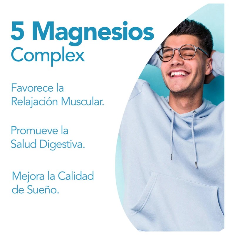 Nuestro suplemento de magnesio te ofrece una fórmula completa con 5 tipos diferentes de magnesio para una absorción óptima y una amplia gama de beneficios para tu salud.