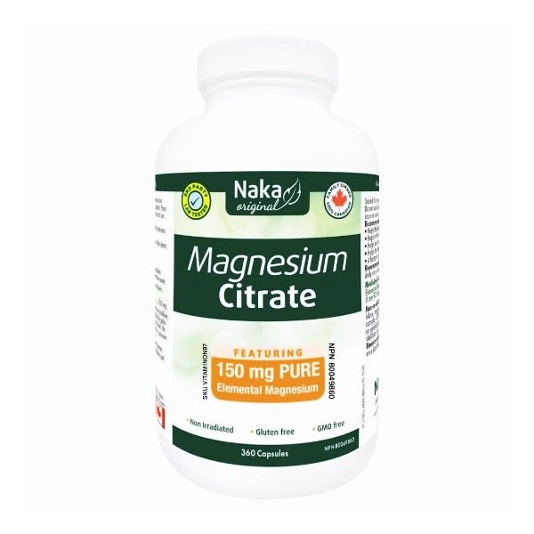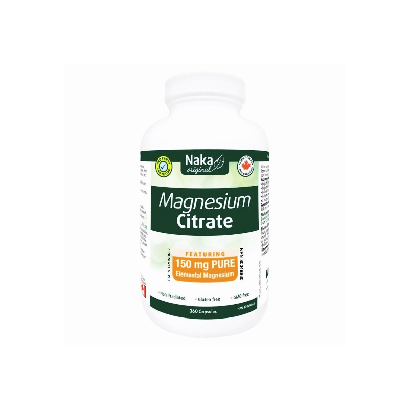 Naka Original Magnesium Citrate 360 Capsules, delivering 150mg of high-potency elemental magnesium per capsule. This premium supplement supports muscle relaxation, bone health, and energy production, making it an essential addition to your daily routine. Crafted in Canada by Naka, a trusted brand, these capsules are formulated for superior absorption, free from gluten, dairy, and artificial additives.
