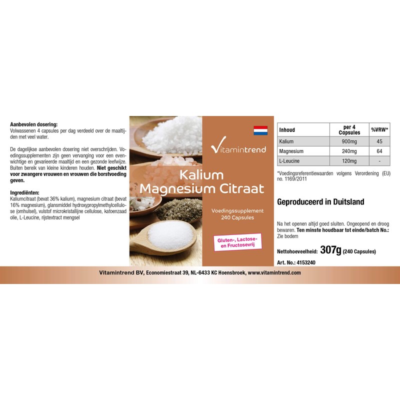 - Vegan and free from: fructose, lactose, gluten, yeast, gelatin, soy, flavours, preservatives, pesticides, fungicides, artificial fertilisers, dyes, stabilisers, GMO, magnesium stearate, silicon dioxide and allergens. Magnesium with potassium from Vitamintrend with excellent absorption