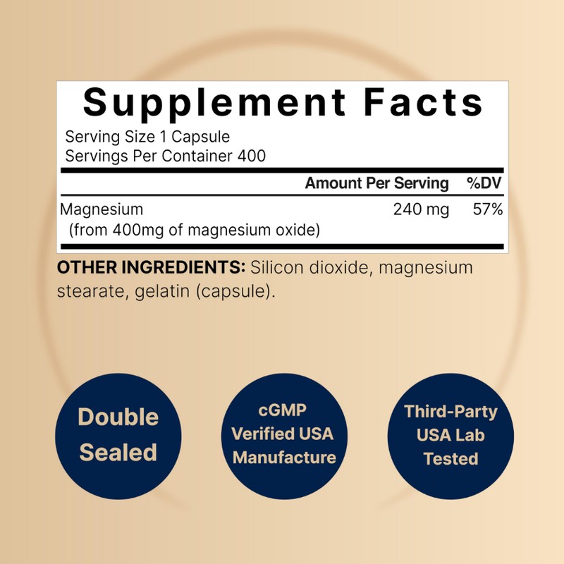 Bulk supply of 400 capsules per bottle. 1 capsule serving size. 400mg dose of magnesium oxide provides 240mg of high-purity elemental magnesium.