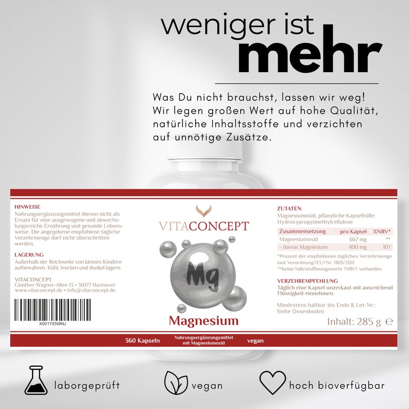 Magnesiumoxid I 360 Kapseln I 660mg I davon 400mg elementares Magnesium pro Kapsel I hochdosiert I Jahresvorrat I vegan I in Deutschland produziert I VITACONCEPT®