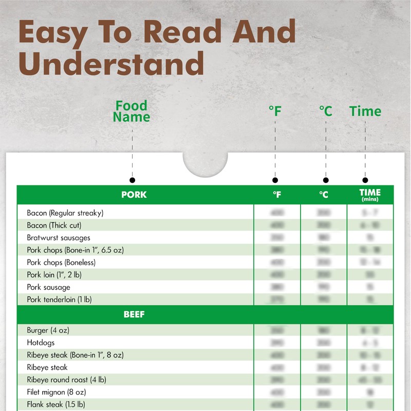 Portable and Convenient: The booklet measures 7” x 6.2”, designed for convenience, making it easy to bring with you wherever you go. The detailed instructions include steak doneness, tips & tricks, prime rib cook temperature chart, safe minimum internal meat temps, etc. Whether you're a beginner or an experienced air fryer user, this cheat sheet is a valuable tool that enhances your cooking experience.