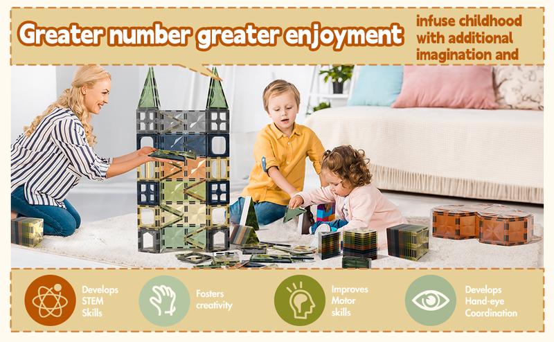 【Magnetic Building Blocks】Our magnetic block set features sealed edges and sturdy construction made from non-toxic, eco-friendly materials, ensuring safe and secure play. Perfect for kids ages 4–8 and up to play safely and creatively. 【Magnetic Track & Castle Building】These vibrant and fun-patterned magnetic tiles spark imagination. Perfect for immersive play, enhancing creativity and sensory development. Ideal for kids ages 3–8 to build magnetic structures. 【STEM Educational Toy】Enhance hand-eye coordination, logical thinking, and creativity with these educational magnetic tiles. A great choice for encouraging STEM learning through fun and engaging play. 【Interactive & Fun】The set includes an instruction sheet, 16 hexagon sticker blocks, 4 glowing balls, 4 regular balls, 1 hexagon slide, 2 UFO light pieces, 4 dinosaur magnetic pieces, 22 track parts, 33 assorted magnetic tiles, and 2 sheets of alphabet and animal stickers. Children can build structures and scenes with easy-to-connect, endlessly stackable magnetic pieces. 【Perfect Learning Gift】An ideal magnetic building toy for kids of all ages—especially great for exploring and building in virtual or physical settings. Perfect for group activities or classroom use. Great gift for birthdays, Christmas, Children’s Day, STEM events, school activities, or as a surprise present.