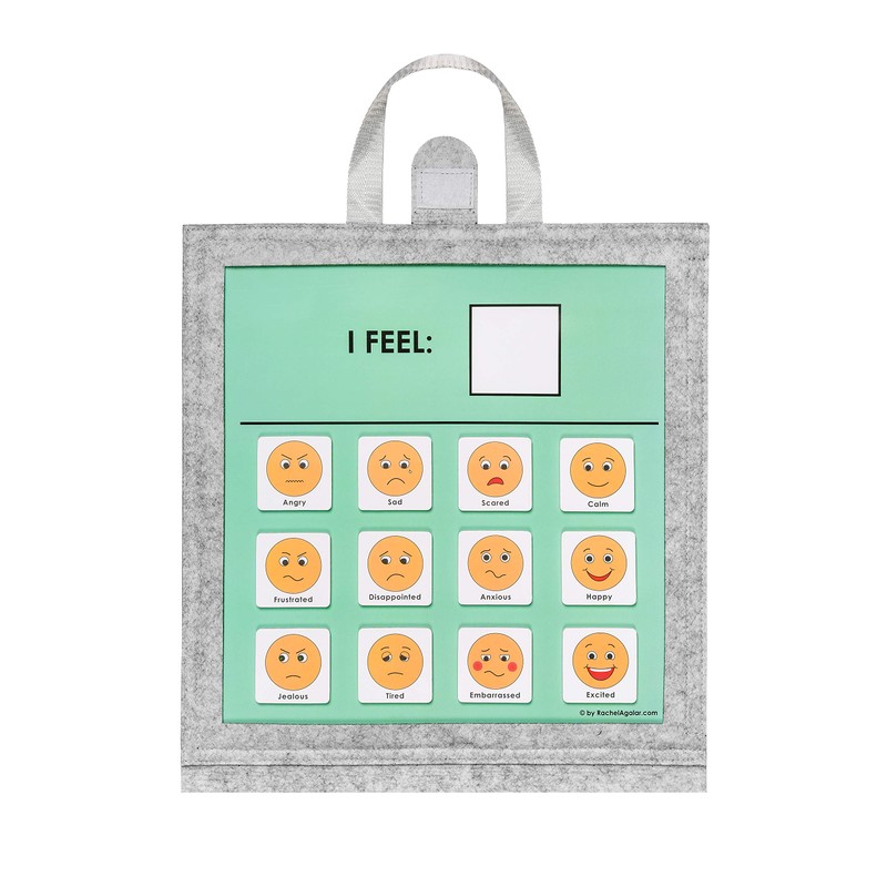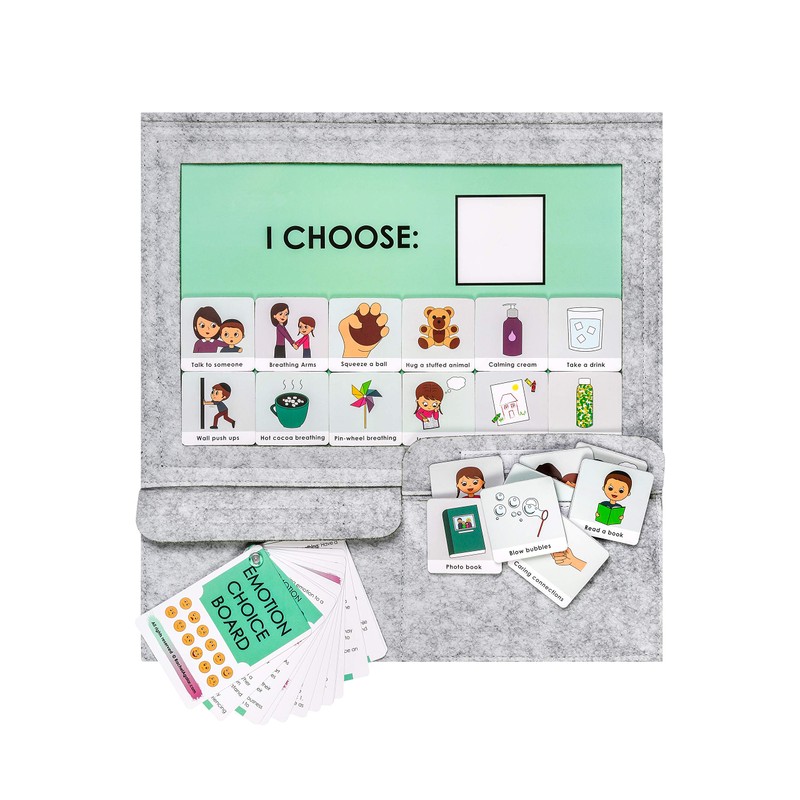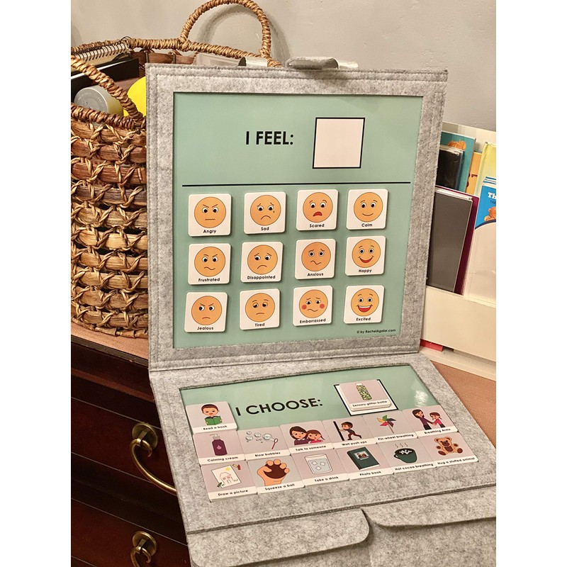 - HIGH QUALITY DESIGN: Light grey felt material, foldable carry case for easy "to go" or store away in your calming corner. It has 2 magnetic boards inside: the top board has space to present the feeling faces. The bottom board has space to present most of the "I choose" regulation choices. There is a mirror on the back side, and pockets to store the manual, and extra choices so that little ones won't get overwhelmed from too many choice options.