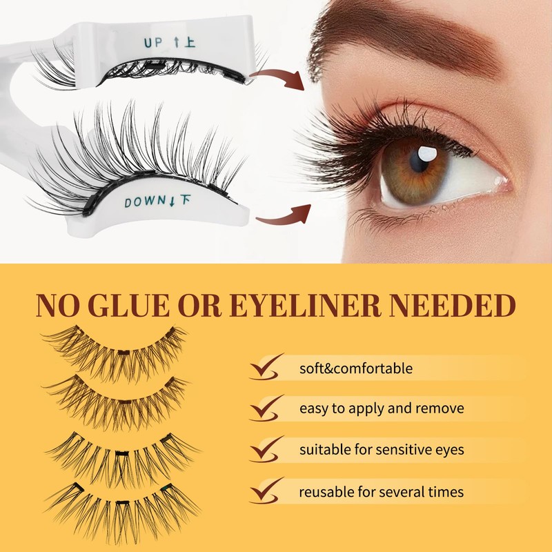 - No glue or eyeliner required: Our improved magnetic eyelashes without eyeliner provide a comfortable fit for people with sensitive eyes. So you can say goodbye to the glue mess for beginners. The magnetic design ensures a secure fit without eyelash glue, so you don't have to worry about your magnetic eyelashes falling off! And it can be easily combined with any cosmetics without eyeliner, specially developed for lazy people