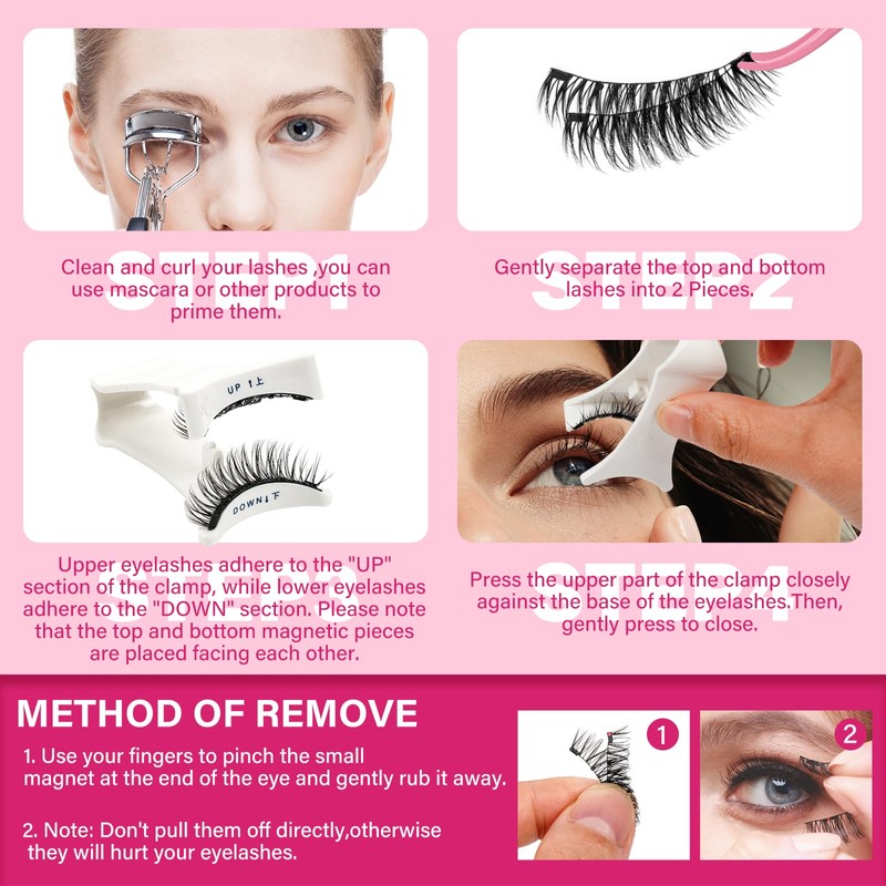 - Easy To Wear: This magnetic false eyelash divides an eyelash into several parts, each part has some magnetic strip clips on both sides, you just need to fix the false eyelash on the eyelash curler, and then angle the magnetic eyelash curler on your own eyelashes. Effectively save your make-up time.