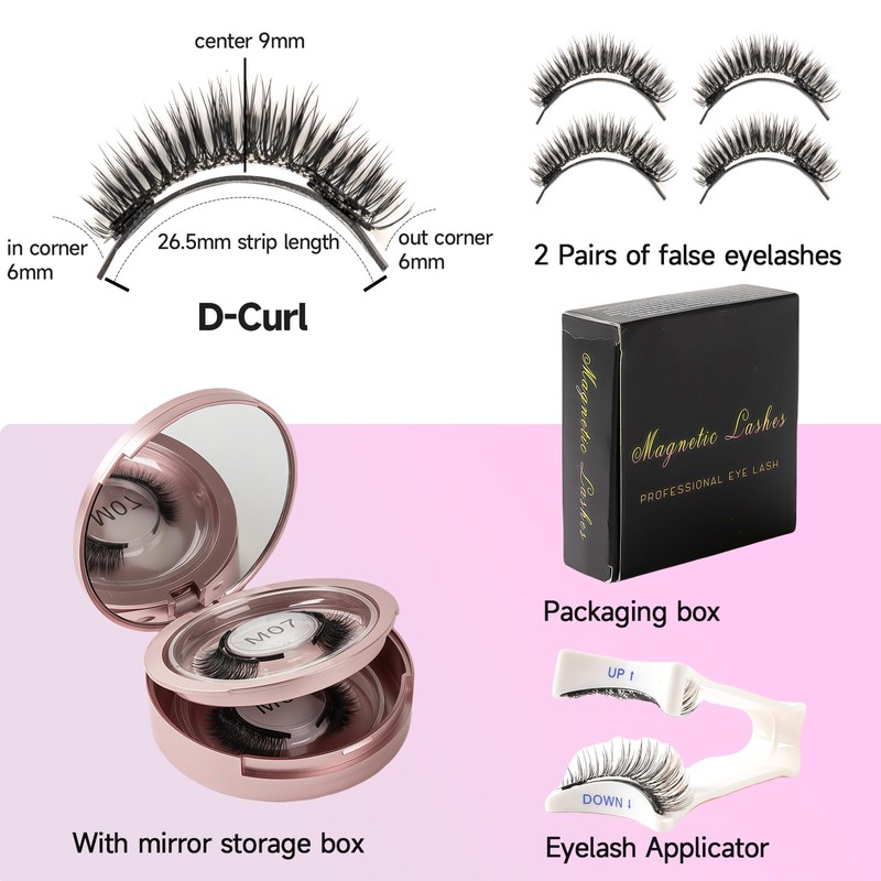 Product packaging: 2 pairs of magnetic false eyelashes, 1 double-layer storage box with mirror for false eyelashes, 1 packaging color box (with instructions), 1 eyelash applicator. The double-layer box with built-in mirror stores two pairs of best magnetic lashes. Its compact and comprehensive design saves space and is hassle-free, making it the best choice for your travel