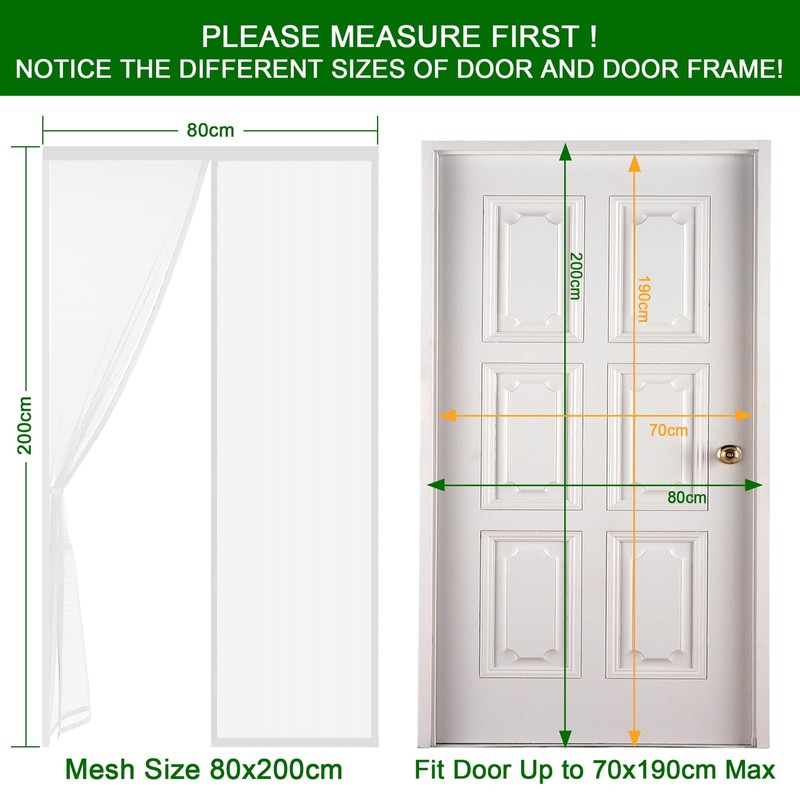 - Easy installation: the fly screen door is very easy to install. Quick and easy installation with Velcro strap (included). It is removable, portable and washable. When winter comes, you can take it off and store it for next year. Dimensions: 80 x 200 cm.