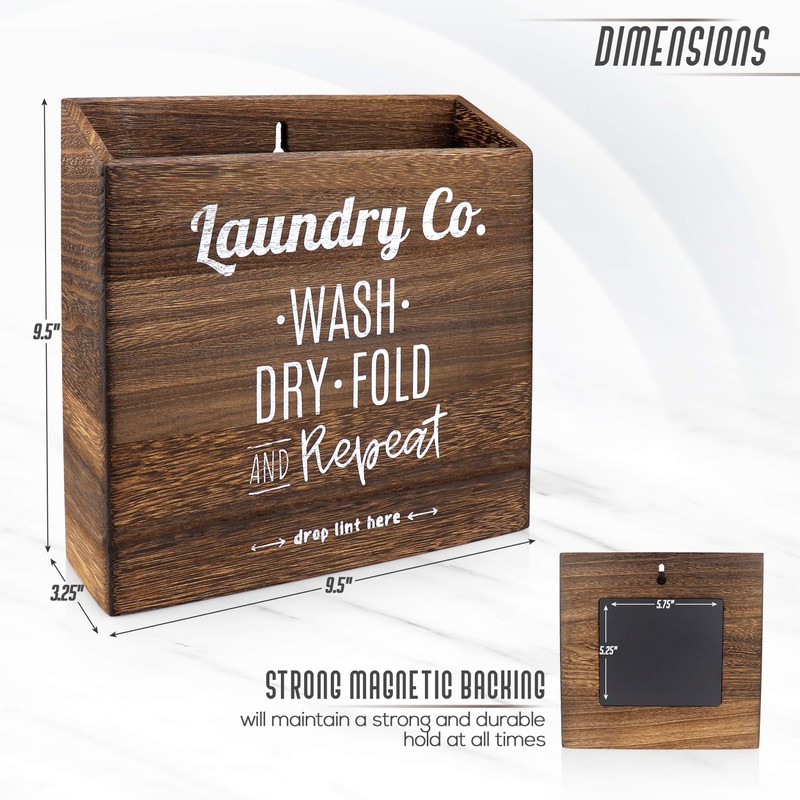 - Wherever You Wish – Select the spot that suits your needs! Crafted of wood, your lint holder mounts to the wall or sticks to your washer or dryer thanks to its magnetic back and keyhole hanger.