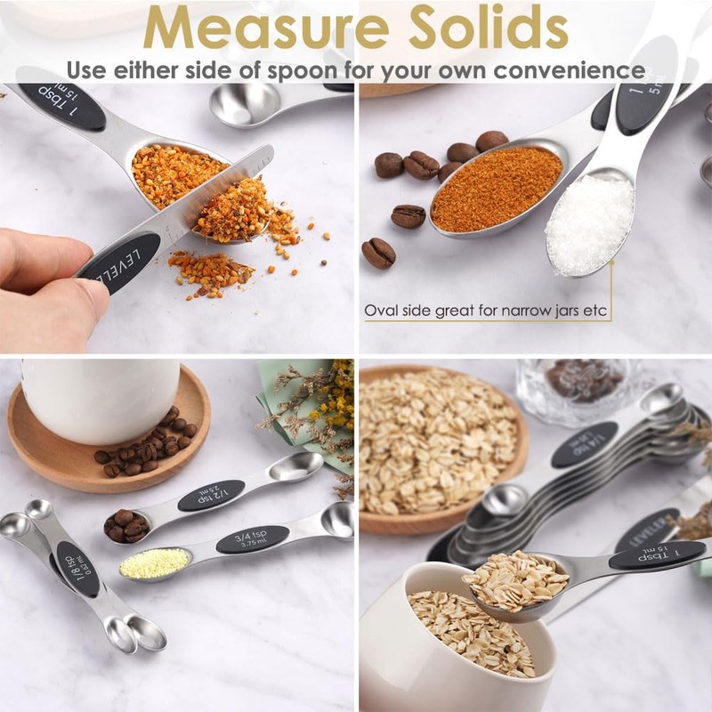 - 8 PIECES MEASURING SPOONS SET: Including 7 Double Sided Measuring Spoons and 1 Leveler: 1/8 tsp, 1/4 tsp, 1/2 tsp, 3/4 tsp, 1 tsp, 1/2 tbsp, 1 tbsp as well as 1 leveler for removing excess ingredients so that you can cook more accurately and hygienic. The spoon sets make it easy to separate dry and liquid ingredients when measuring. The design also enables you to use it in more scenarios, for baking, cooking, and measuring spices, salt, tea, coffee and oil, etc.