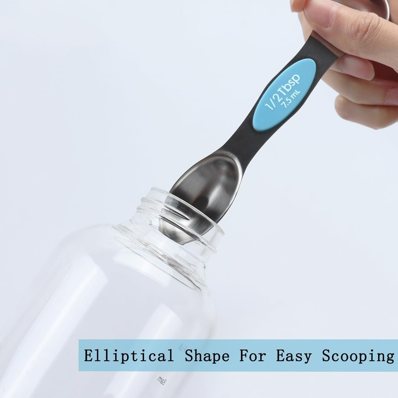 Includes 7 spoons (1/8 tsp, 1/4 tsp, 1/2 tsp, 3/4 tsp, 1 tsp, 1/2 Tbsp, 1 Tbsp) + leveler for precise ingredient scraping. Ideal for spices, coffee, protein powder, or medications.
