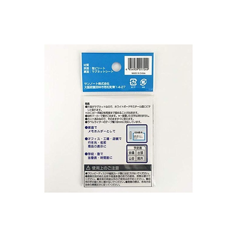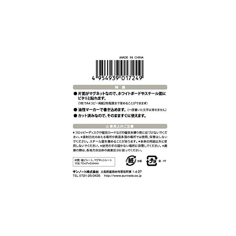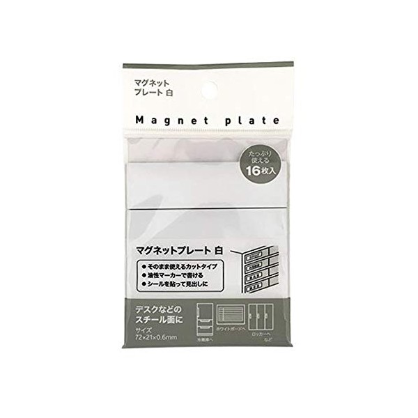 - Size of 1 sheet (4 pieces) (approx.) 3.3 x 2.8 inches (84 x 72 mm); Size of 1 sheet (approximate): 0.8 x 2.8 inches (21 x 72 mm); Material/Surface: PVC sheet; Back: Magnetic sheet; Uses: Magnetic, Plate, Memo Holder, Keyword, Magnetic, Magnetic, Plaque, 1000 yen 1. Product Name: Magnetic plates, white, 16 sheets; Manufacturer name, Sunnote, Co., Ltd.; Management unit: 10 pieces / 300 pieces / Quantity: 16 pieces