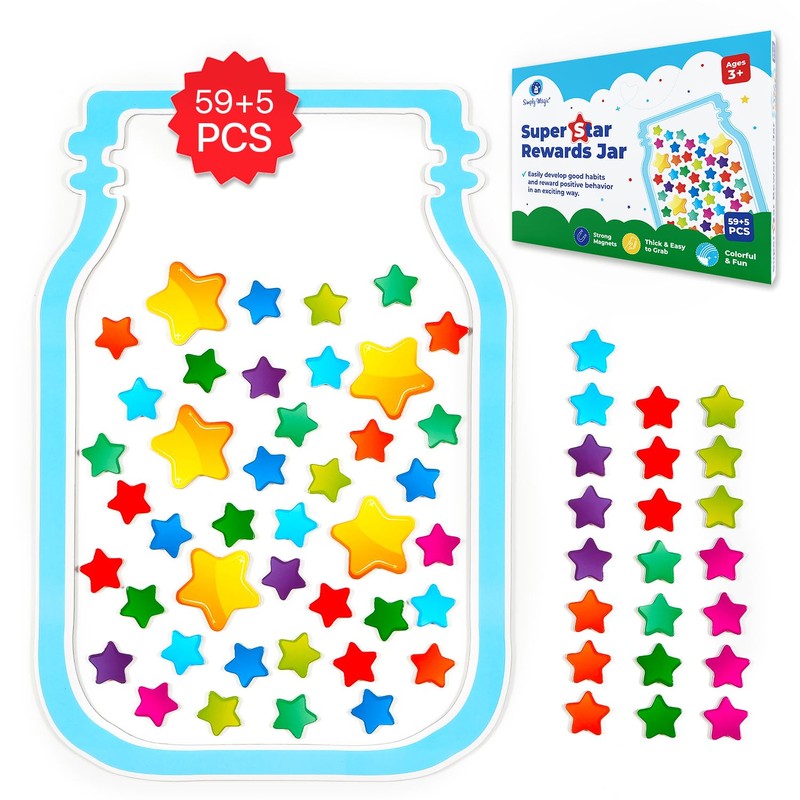 - ✅ LARGE, DURABLE & COLORFUL REWARD JAR SET - Strong magnets, thick & easy to grab stars! Simply Magic behavior chart for classroom includes 59 colorful stars measuring 1" x 1", 5 golden stars measuring 1,8" x 1,8" and 1 jar measuring 15" x 10". A fun, visual and interactive way to promote positive behavior at home or in the classroom!