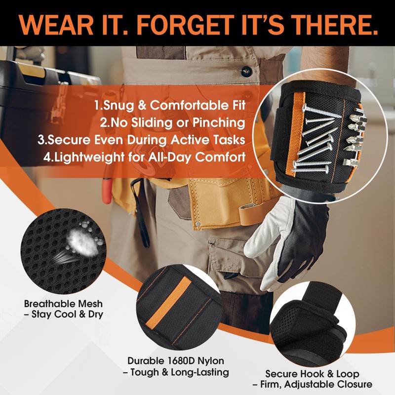The breathable mesh lining and smart elastic loop design make it easy to wear, even with one hand. Whether you're fixing a leaky pipe, assembling furniture, or building a treehouse, the Oimyalsi magnetic wristband keeps everything within reach.