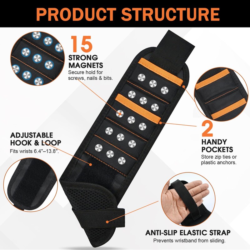 - 【Powerful Magnetic Hold for Small Metal Parts】Equipped with 15 Powerful magnets, this magnetic wristband securely holds screws, nails, bolts, drill bits, and other small metal parts — keeping everything you need within easy reach while you work.