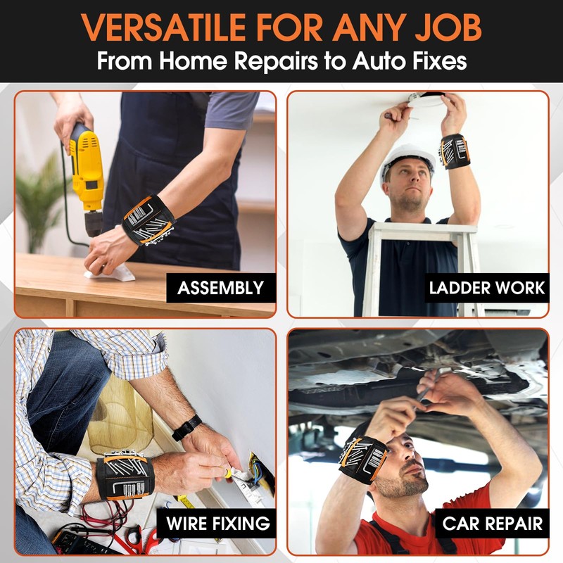 - 【Ditch the Bulky Tool Belt – Go Hands-Free】No more clunky tool belts. Our lightweight wristband acts as a tool belt alternative, with 5 magnetic zones that keep essential hardware organized and always within reach — especially handy when you're on a ladder or in tight spaces.