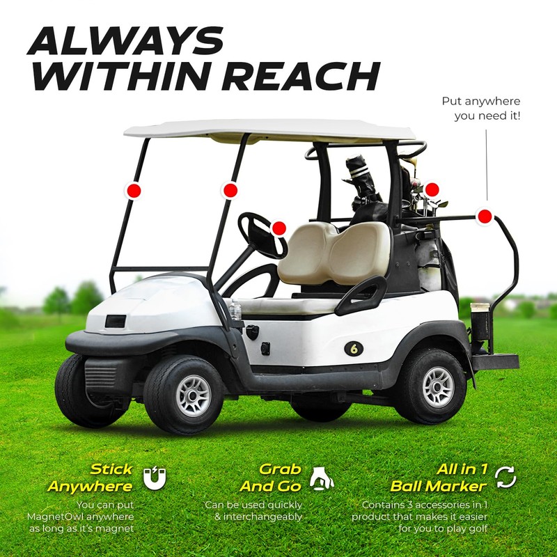 Whether you have a favorite color or a preferred fabric, MagnetOwl lets you continue using them. It works with virtually any golf towel with a grommeted or stitch-finished hole or hanging loop. Unscrew the MagnetOwl, slip it through the towel's hole and reconnect the 2 pieces. Place the magnetic golf towel clip on any metal surface of your choosing and be ready when dewy grass dampens your driver or you need to dry off your golf ball. With 2 removable ball markers to mark your spot, MagnetOwl is the most versatile of all your golf-gear.
