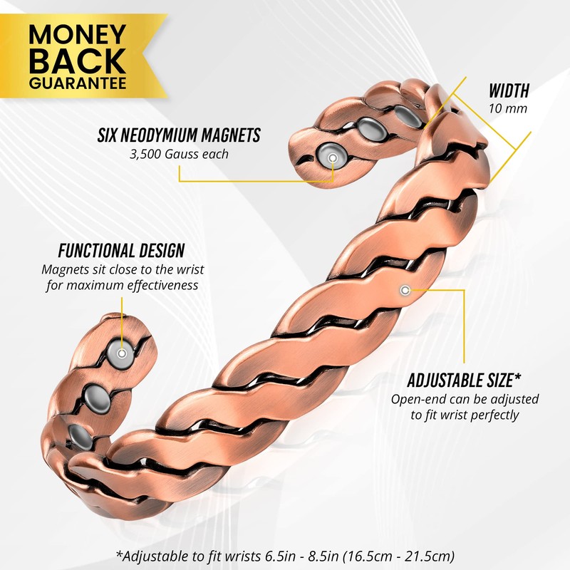 - Ultra-strong magnets: the strongest copper bangle on the market, with six strong neodymium magnets (3500 gauss per magnet) for maximum results