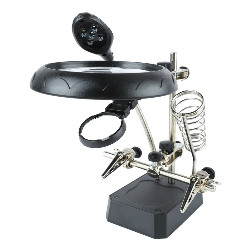 1、WITH SOLDERING BASE: This soldering iron base can support a wide range of iron sizes and shapes, making soldering more stable and easier. 2、BRIGHT LED LAMP: The lamp is bright enough and has a very wide radiation range. This can makes users easy to see details and operations. 3、FLEXIBLE AUXILIARY CLIPS: The desktop magnifier soldering stand has 2 auxiliary clips. The auxiliary clamp and the bracket use the sliding block locking function, which can prevent loosening when clamping heavy objects.It can be freely adjusted to any angle or height required to better fix the items to be used. 4、WIDE APPLICATION: This helping hands magnifying glass stand is very suitable for electronic welding, circuit board repair, handicraft projects, craft engraving, painting miniature works, reading, macro photography, architectural models, debris removal, sawing applications, welding enthusiasts,it is the perfect assistant for electricians, jewelers and users who use solder or small parts. 5、RECHARGEABLE BATTERY: The battery (not included) can use USB wire to recharge. The battery (not included) can be replaced as well.