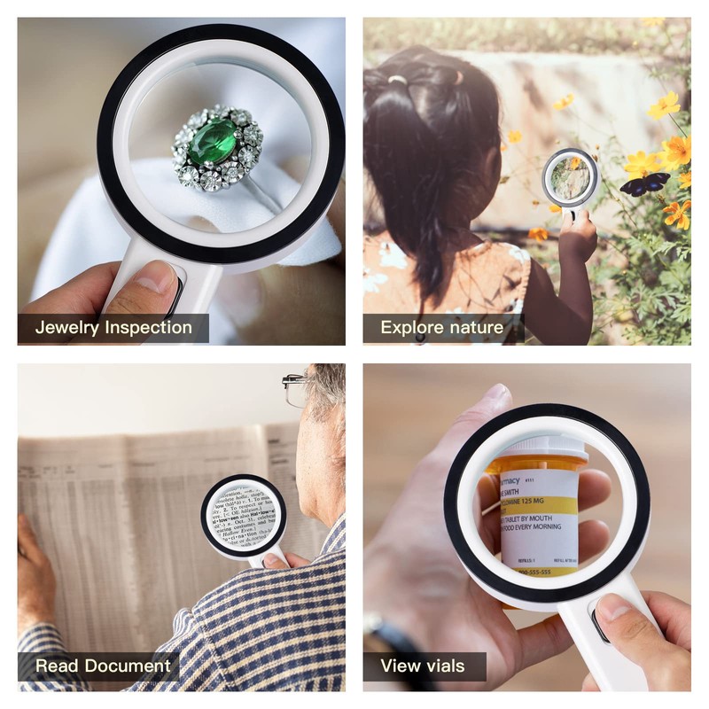 - 【LED Magnifying Glass】This magnifier with 12 pcs high quality, ultra-bright LED lights. The lighted magnifying glass do a good job illuminating what is being looking at when you read or work in the dark, especially help people with macular degeneration see more clearly.