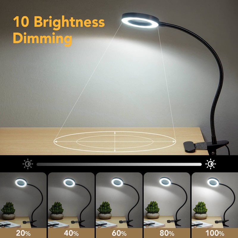 - 【3 MODES WITH 10 BRIGHTNESS DIMMABLE】Magnifying Glass with Light has 3 color temperatures: warm light/3000K, warm white light/4500K and white light/6500K. Each lighting mode has 10 brightness dimming levels to meet your different needs. Clamp lamp for bedside or nightstand, the clip on desk lamp with clamp will be ideal for reading before bed, comfortable light and convenience bring you comfort