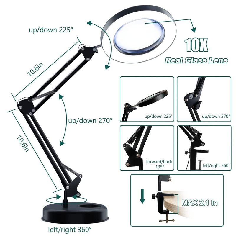 - 【2-in-1 Desk Lamp & Clamp Light】Magnifying glass with light and stand come with a weighted base and C-clip. You can use the base as a table lamp, or mount it on any flat surface (maximum thickness <2.1") as a clip light. The clamp can be easily mounted on a desktop, shelf, or workbench without any tools, which not only saves space, but also can be easily rotated to free up hands.
