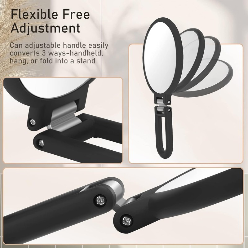 - Versatile Design: Foldable handle allows for multiple viewing angles, transforming it into a handheld, tabletop, or hanging mirror.