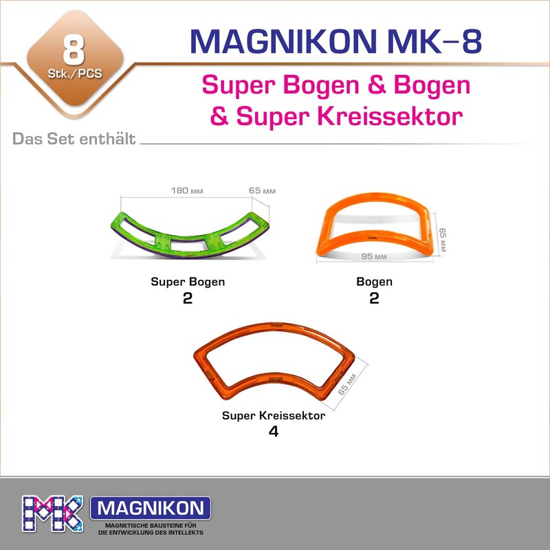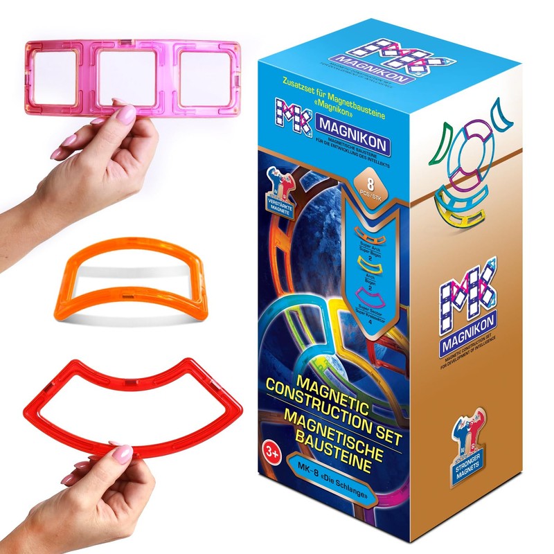 - Additional set: magnetic parts offer the opportunity to fantasise without limits. You do not have to limit your child to the number of pieces of a magnetic building kit. All large Magnikon magnetic parts are universal and compatible with each other. The sets are very diverse: simple geometric shapes, wheels, arches, a swivel axis for a swing and other accessories.