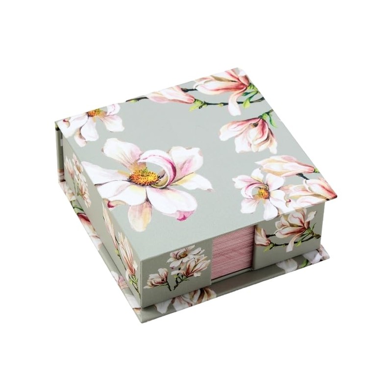 - Note box made of sturdy cardboard, lid with magnetic closure, 200 notes printed on both sides: front with the decor of the box, back plain 11 x 11 x 4.5 cm