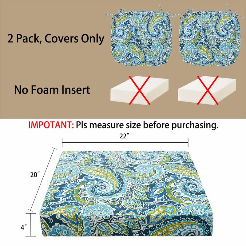 Magpie Fabrics Outdoor Cushion Cover Replacement 2 Pack, NO Insert! Water Repellent Slipcover with Ties Decor for Patio Garden Chair Seat Bench Wicker(Paisley Lapis Green, 22x20x4 Inch)
