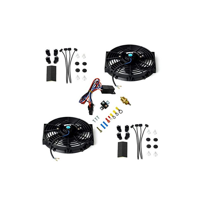 MAGQOO 10" 12V Radiator Cooling Fan Fin Probe Push Pull Electric Universal Slim Fan w/ Thermostat Relay Switch Mounting Kit Black (Pack of 2)