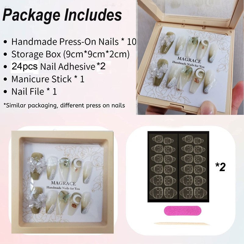 - 【Package Contains】Handmade pressed on nails * 10 (Please refer to the product picture for how to measure and choose the size). Nails adhesive tabs * 24. nail file * 1. manicure stick * 1, storage box * 1. ※ It is recommended to use the jelly glue