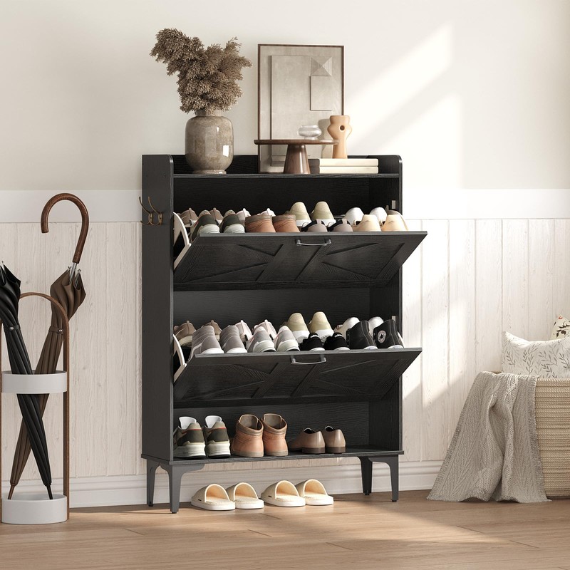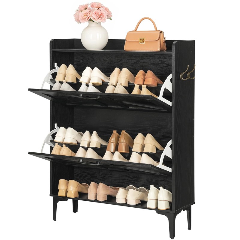 - Freestanding Shoe Cabinet Organizer: This slim shoe storage cabinet consists of two flip drawers and two open shelves. The flip drawers and open bottom shelf are designed for storing shoes, while the wide top shelf keeps commuting essentials within reach