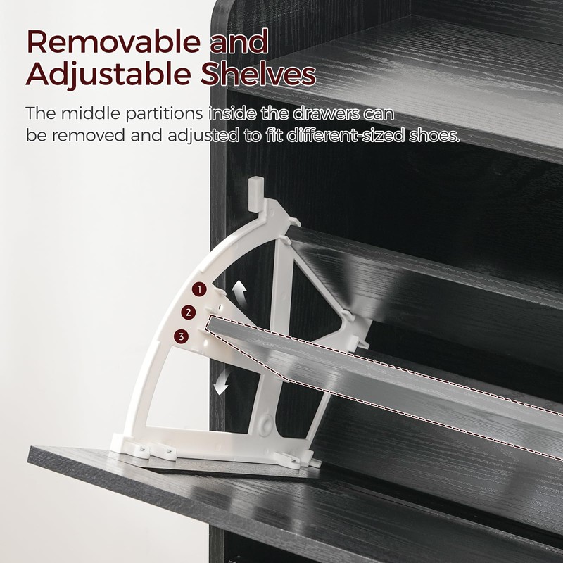 - Ample Storage Space: This narrow shoe rack cabinet has 2 flip drawers to hold 24-32 pairs of shoes. The middle shelf within each flip drawer has 3 adjustable positions to organize shoes of varying sizes