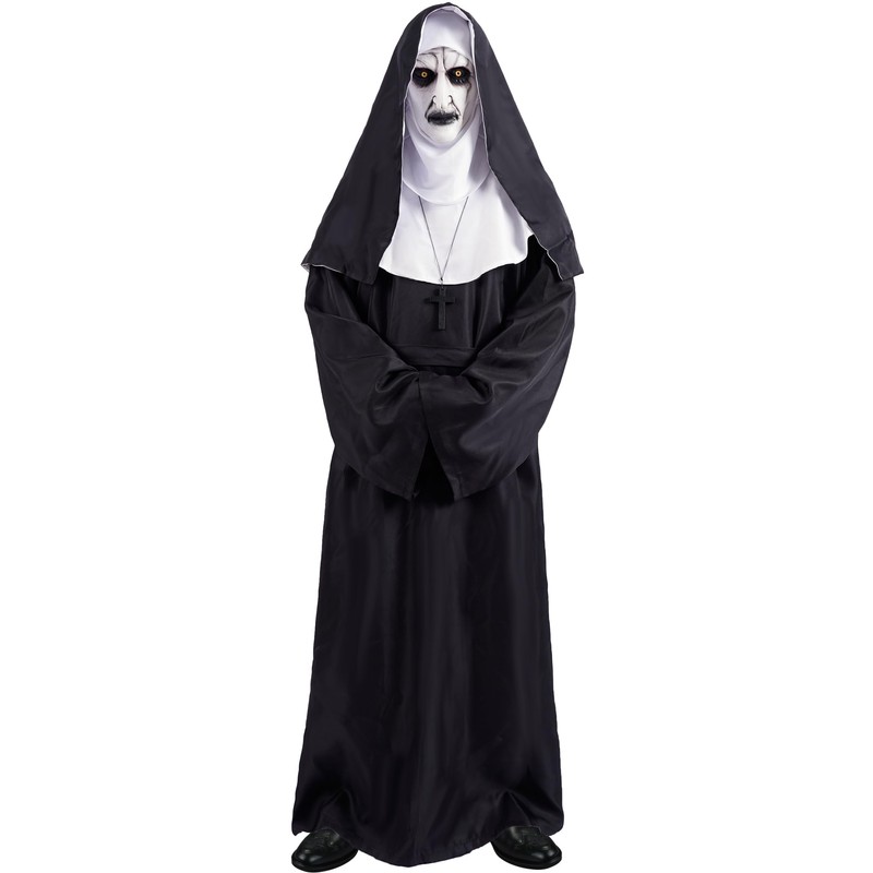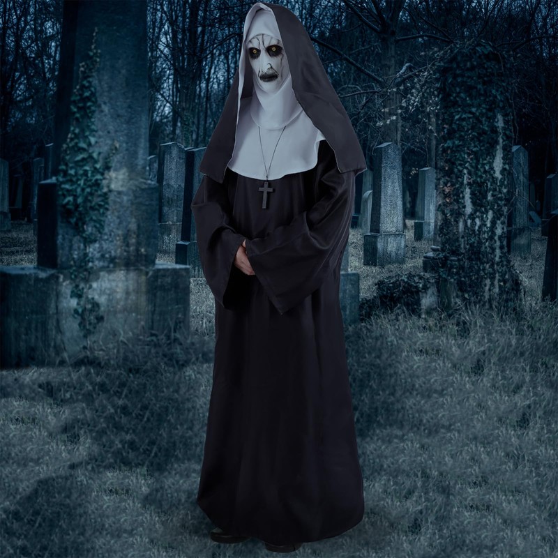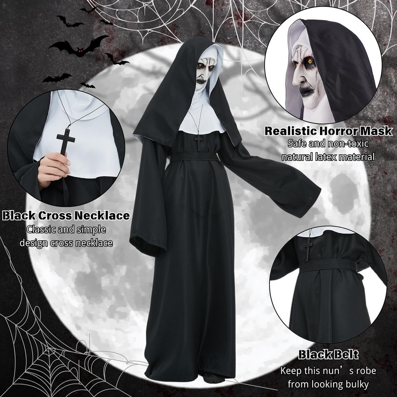 - Super Value Package: This spooky nun costume set includes a black robe, belt, realistic mask, headpiece, and cross necklace. The robe is crafted from durable polyester for a comfortable fit. The mask adds a terrifying touch, and the cross necklace completes the classic nun look.